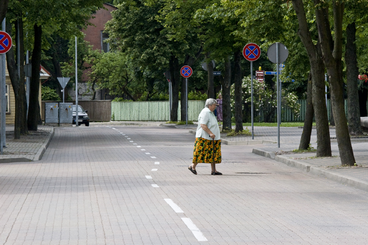 This is one of my favorite “decisive moments” photos – as Cartier Bresson liked to put it. I was focusing on the beautiful old trees, the symmetry and color of the traffic signs, and the funny white street markings, when she decided to walk across the street, making the image complete!