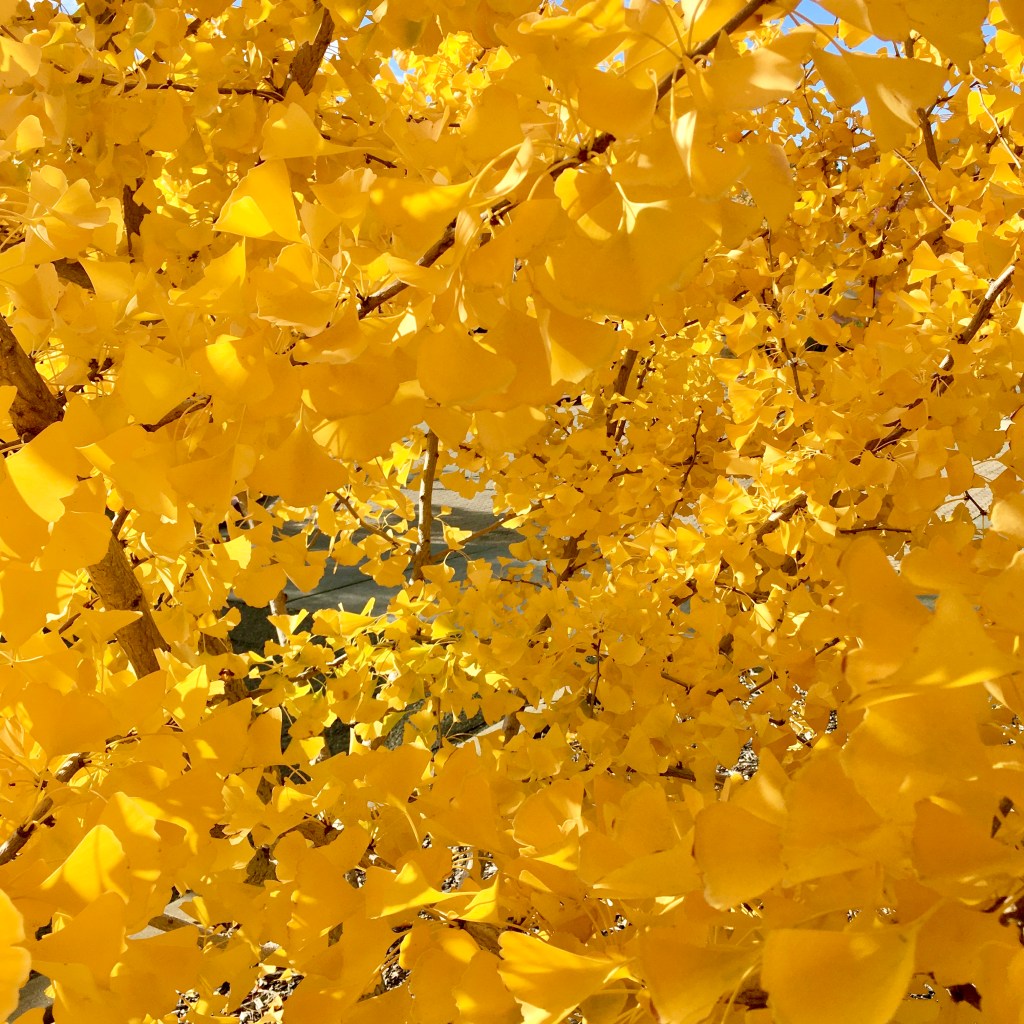 The ginkgo trees I passed on a walk today seem to have weathered the rain well. In fact, the cool nights seem to have added depth to their golden yellow. There are few trees that can match such autumn beauty and color in my view.